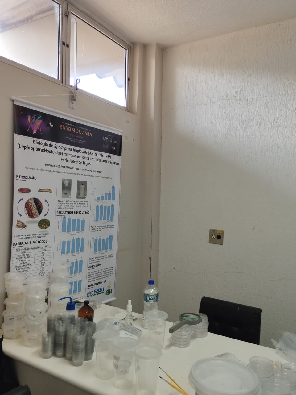 esquerda Sobre o laboratório: O LABIN foi criado com o objetivo de criar e manter diversas espécies de lagartas, percevejos e parasitas que podem ser utilizados em pesquisas de controle biológico. Além das atividades de inoculação, retirada de pupas e separação de gêneros, os estagiários que atuam no LABIN selecionam as melhores populações para que os alunos pesquisadores possam utilizar em seus experimentos ou mesmo para potenciais clientes.