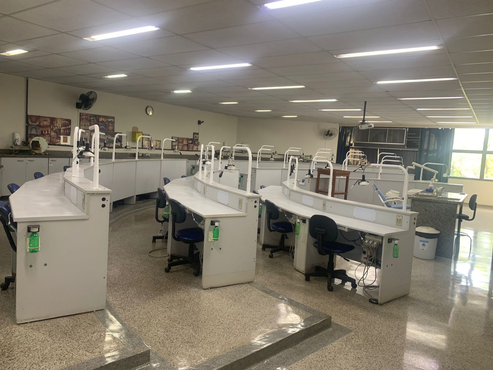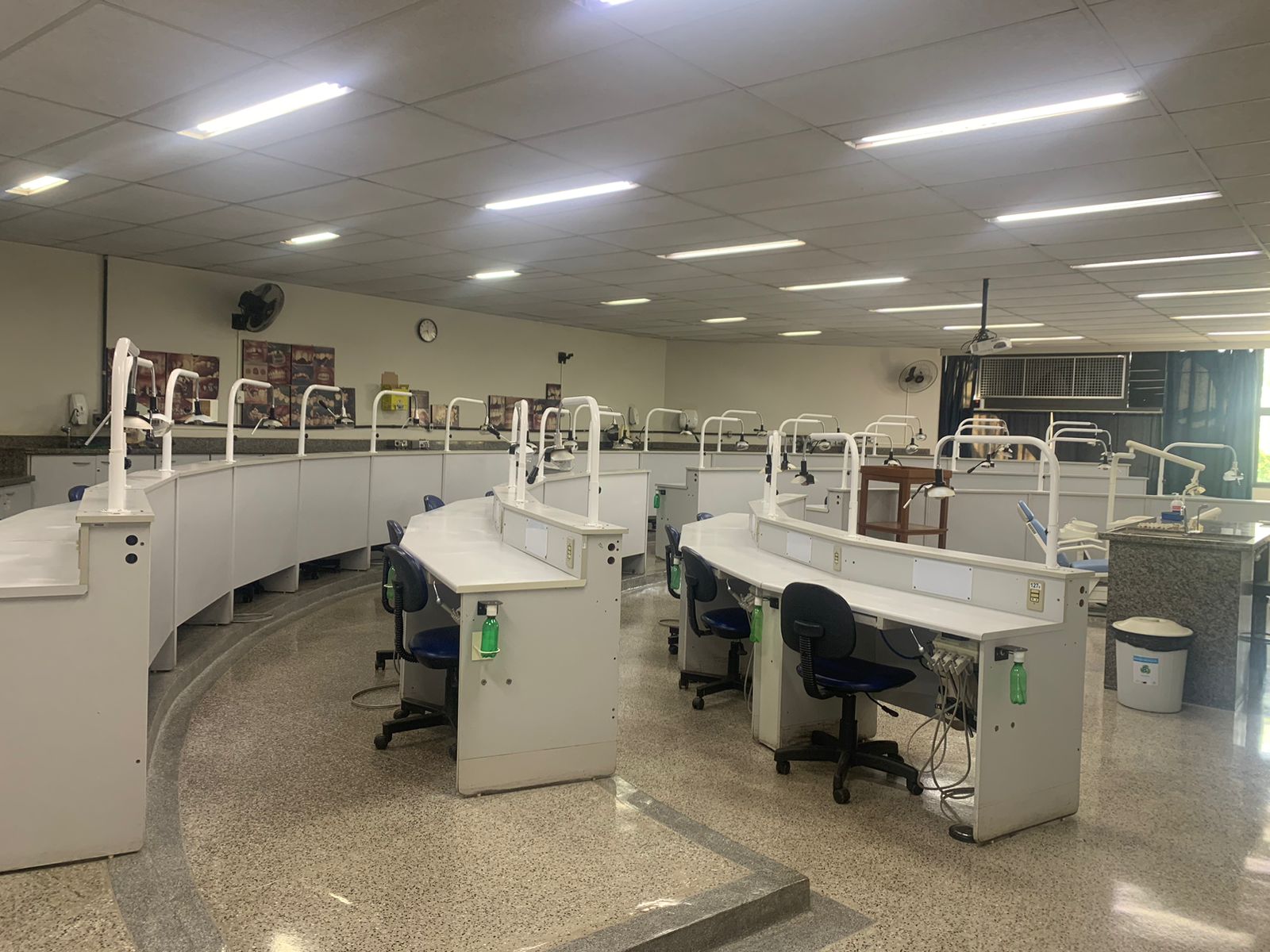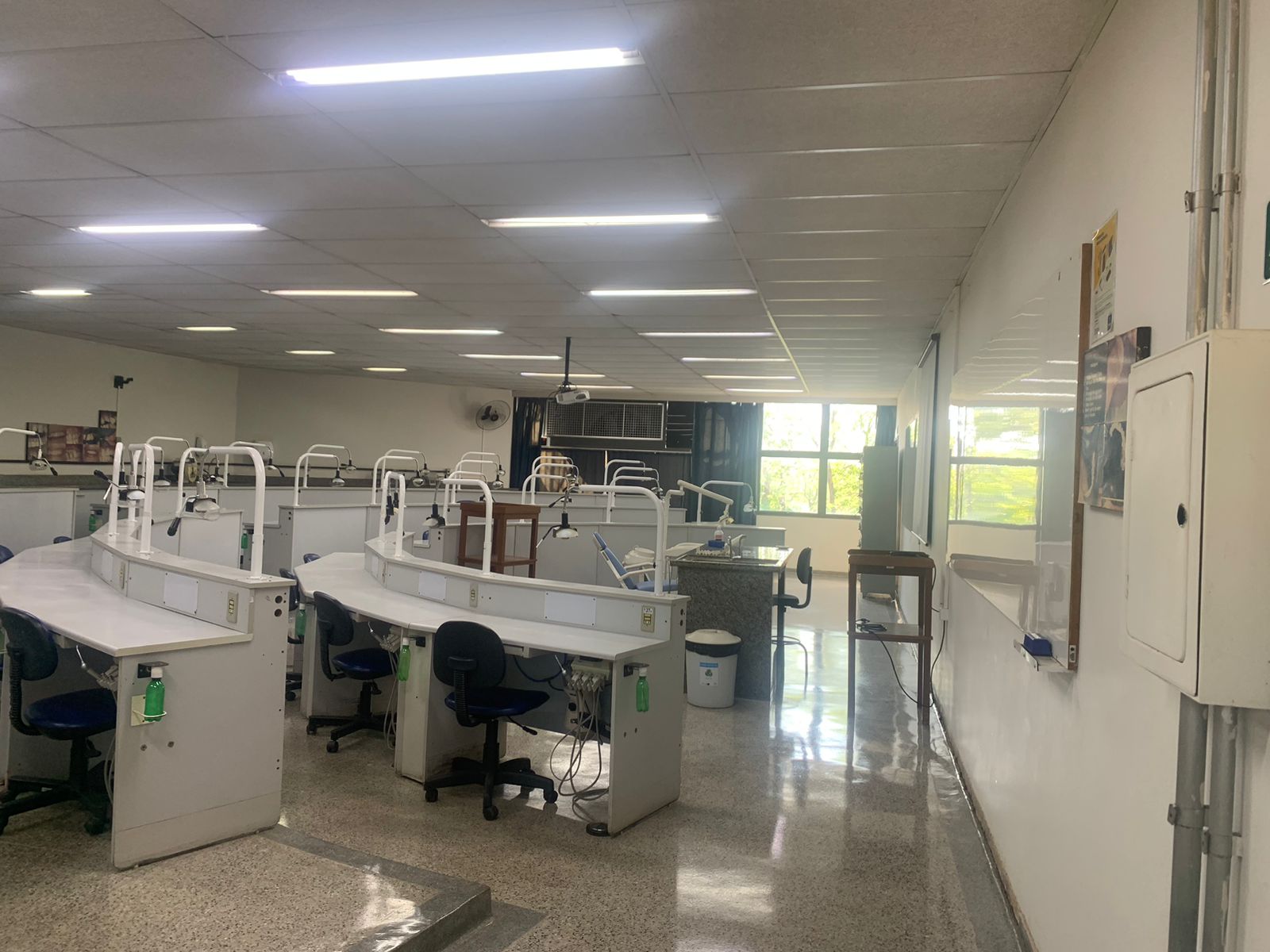 esquerda Sobre o laboratório: Laboratório de Dentística: Um ambiente projetado para a realização de práticas pré-clínicas, onde os alunos ocupam posições de trabalho que replicam fielmente as configurações encontradas nos consultórios odontológicos, incluindo a ergonomia e os equipamentos necessários para as disciplinas práticas.