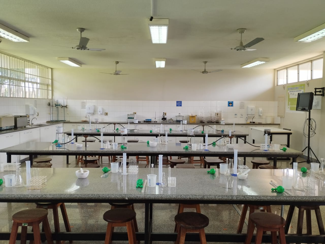 esquerda Sobre o laboratório: Espaço destinado a aulas práticas com experiências químicas, utilizando diversos materiais e reagentes, para aprofundar o estudo sobre as propriedades e sínteses das substâncias químicas, orgânicas, inorgânicas e a estrutura das moléculas que compõem os seres vivos. Além disso, este laboratório também abrange as aulas práticas de bioquímica clínica do curso de medicina veterinária, onde os alunos desenvolvem as práticas de exames laboratoriais bioquímicos dos animais.